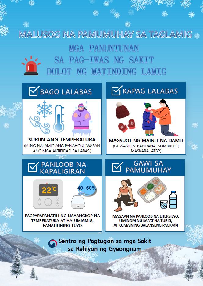 한랭질환 예방수칙(필리핀어) 작성일 2025.12.09 조회 34회 본문 한랭질환 예방수칙 입니다.자세한 사항은 첨부파일을 참고하시기 바랍니다.출처: 질병관리청 첨부파일 한랭질환 포스터_필리핀어.pdf Prev Next 목록으로 Prev Next 목록으로