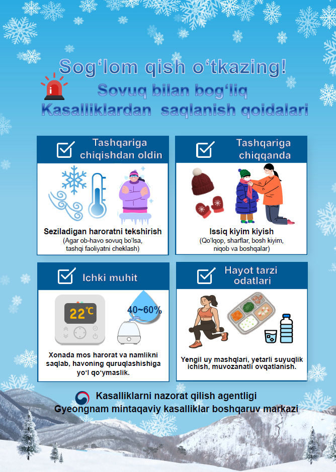 한랭질환 예방수칙(우즈베키스탄어) 작성일 2025.12.09 조회 46회 본문 한랭질환 예방수칙 입니다.자세한 사항은 첨부파일을 참고하시기 바랍니다.출처: 질병관리청 첨부파일 한랭질환 포스터_우즈벡어.pdf Prev Next 목록으로 Prev Next 목록으로